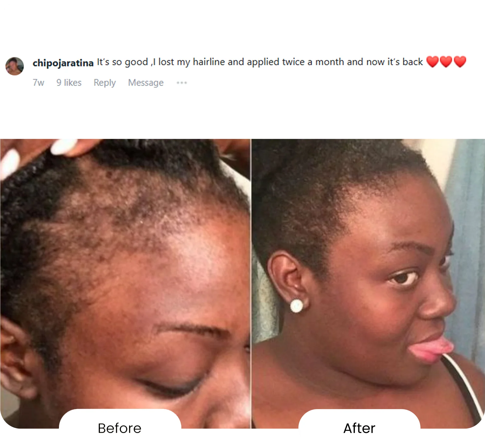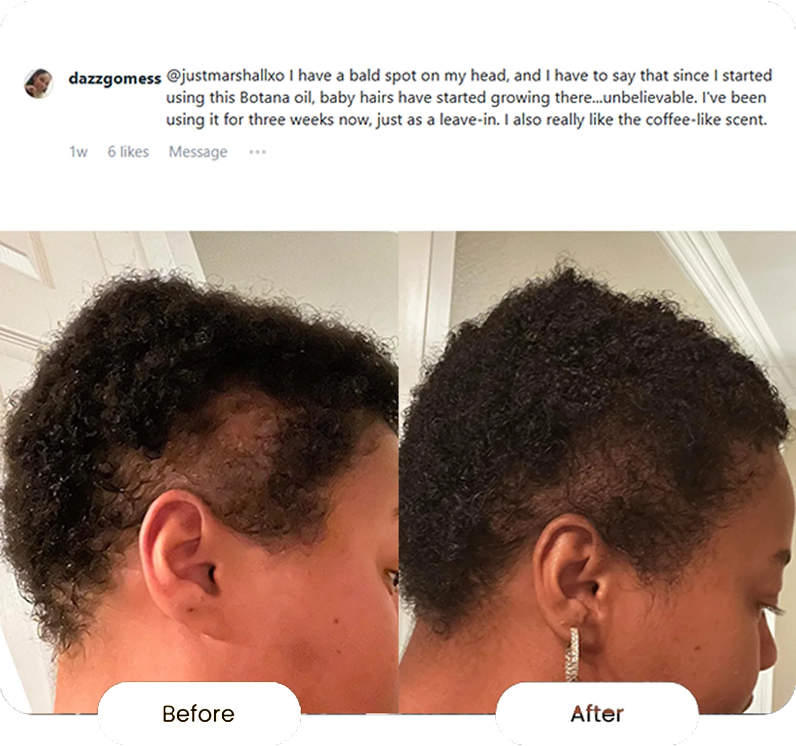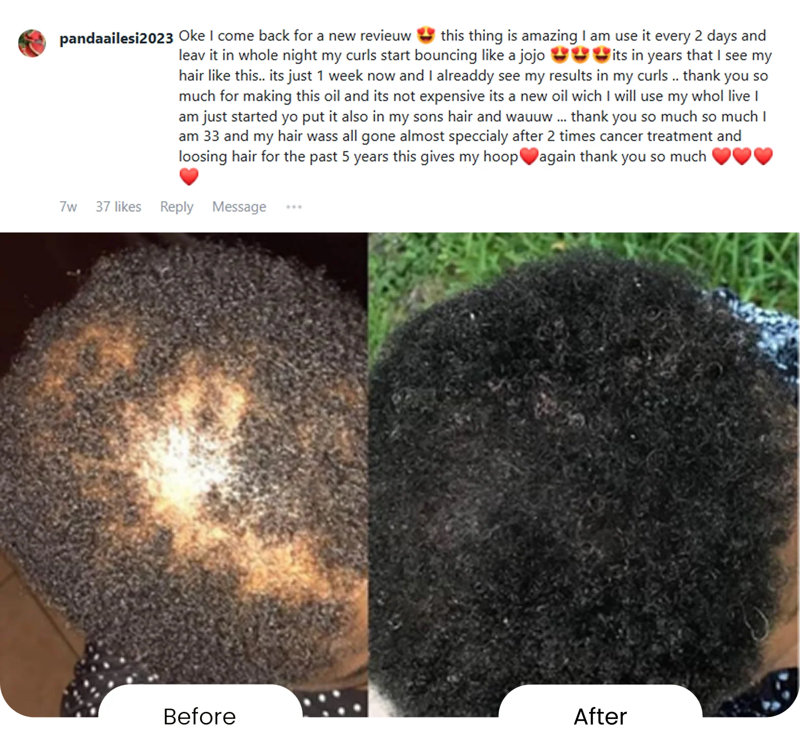 I want to apologize for hassling you about your business. It’s just that I got scammed before but I can say I was wrong, very wrong. I had been using a line of hair care that destroyed my scalp and hair, I’ve tried every medication possible, even got a vertex scalp puncture biopsy…. I ordered your Batana oil. When your oil arrived I stopped using medication and just started using your Batana oil and after a week of just using your oil the pain, inflammation, itching and breaking just calmed down. And after two weeks it’s completely gone. My dermatologist is shocked, she was gonna prescribe betamethasone and midoxil because I’ve tried 2 medi-shampoo’s and 2 steroids in 14 months. I want to say thank you, so much!!